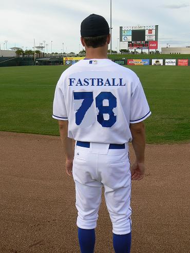 I have to say, I like your suggestion of 78. Despite the fact those high numbers in the 70’s are usually saved for guys on the gridiron who are probably two sammies short of a picnic, I like sticking with the Disco theme. Nothing would show a batter it was merely a piece of piss to strike them out like having them look back at me on the mound and see me wearing the speed of my feeble fastball on my back. I did fancy another step in your thinking, though. If Chad Johnson can legally change his last name to Ocho Cinco, why couldn’t I change my last name to Fastball. Then, we blow it by somebody on the inner half and as they walk to the dugout, in their peripheral, they’ll see: